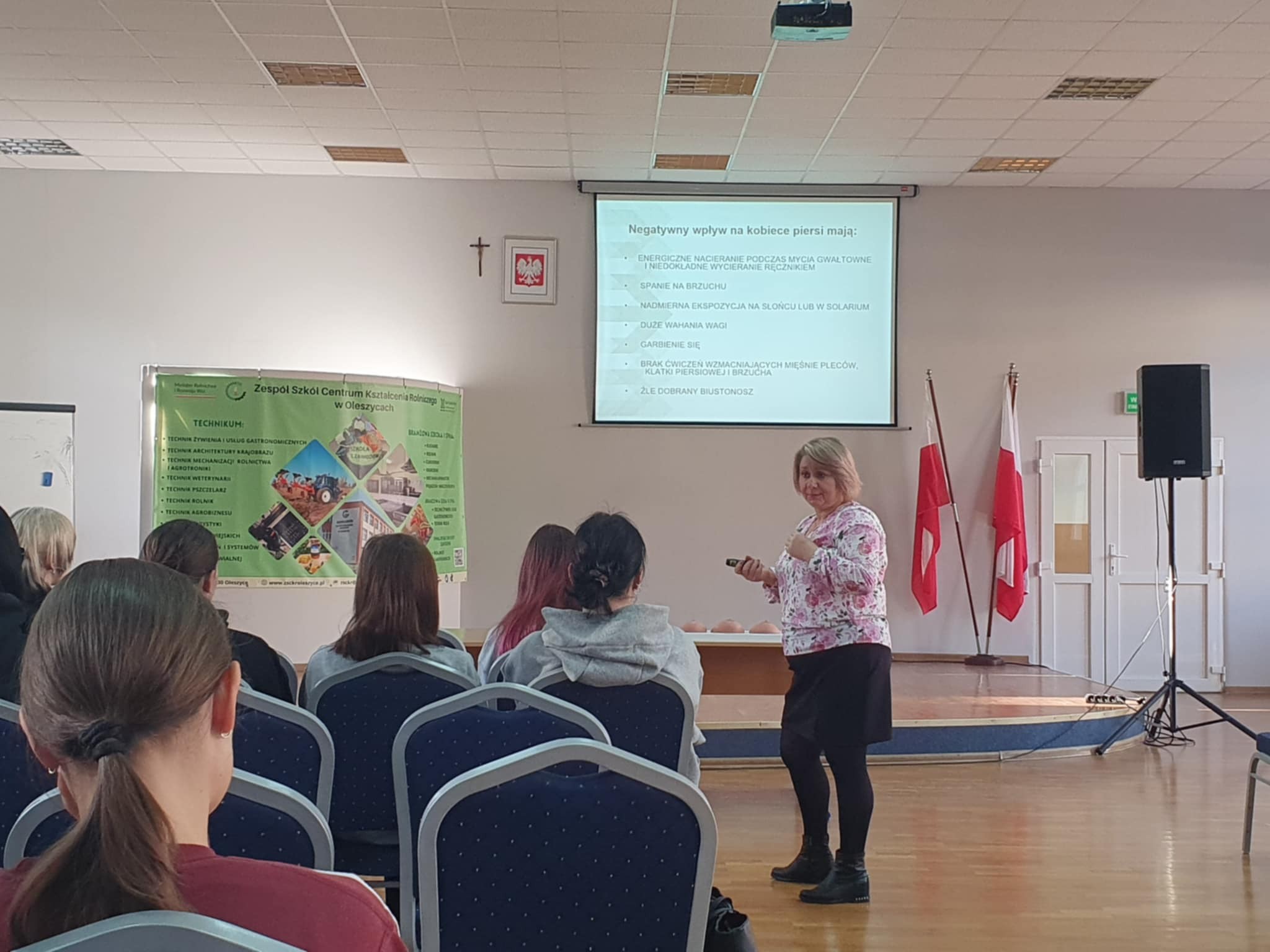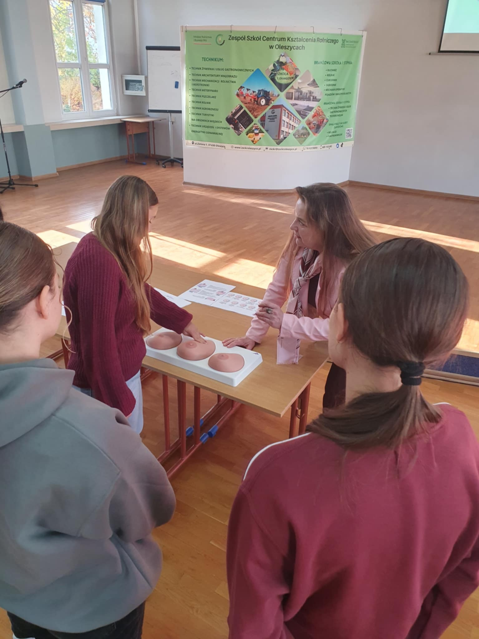 Położna omówiła znaczenie wczesnego wykrywania zmian w piersiach i podkreśliła, że regularne samobadanie jest kluczowe dla zachowania zdrowia. Uczennice dowiedziały się, jak prawidłowo przeprowadzać badanie – zarówno przed lustrem, jak i w pozycji leżącej.